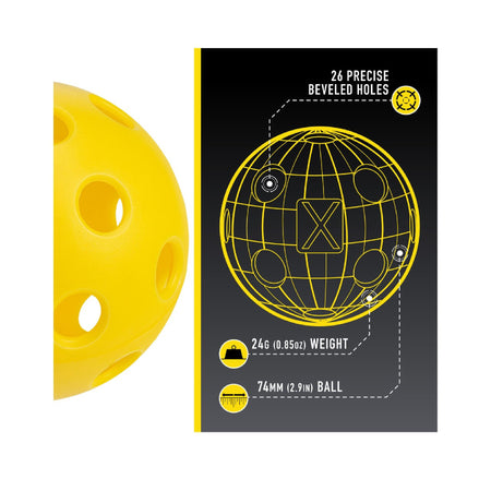The USA Pickleball approved X-26 Indoor balls are one of the finest balls ever created for the sport of pickleball. Using only the best EVA material, our X-26 pickleballs feature 26 precisely beveled holes to help deliver a superb flight pattern and superior balance. Made to withstand hours on the court, the X-26 offers consistent bounce, durability, and playability ensuring a great day of play.