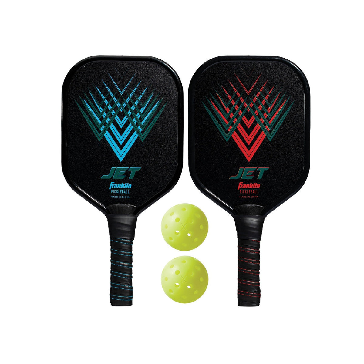 The Franklin Sports Jet paddle set is the perfect combination of playability and functionality. The dual-plated aluminum design creates a strong base for top-notch play. The handles have superior grip and padding for competitive play while still allowing the player superior comfort. Each paddle has been engineered with plastic edging to maximize the paddles' lifetime. The set includes (2) USA Pickleball approved X-40 pickleballs designed for outdoor play. Each ball is 74mm and 26g in weight.
